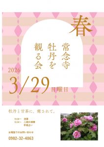 お知らせ 牡丹を観る会(案内) 2026年3月5日 3月29日に『牡丹を観る会』を開催いたします✨✨✨ 13時から降誕会(お釈迦様の誕生日)の法要、13時30分から二胡の演奏会を行います。 会館では昨年同様、手相占いもあります😊 境内では甘茶や緑茶、お菓子と共に牡丹を楽しんでいただけます🌸🍵 甘茶はお持ち帰りもできますので、必要な方は水筒やペットボトルをお持ちください。 お檀家さん以外も大歓迎ですので、お誘い合わせの上来てください😊 お知らせ一覧に戻る